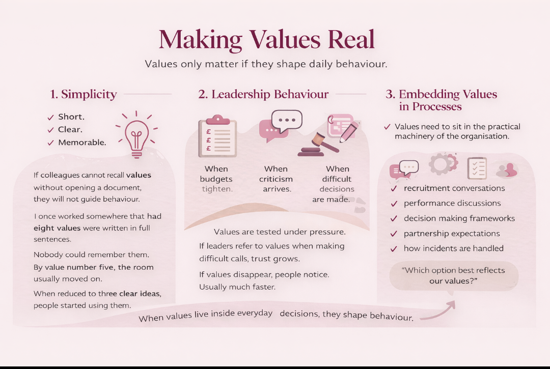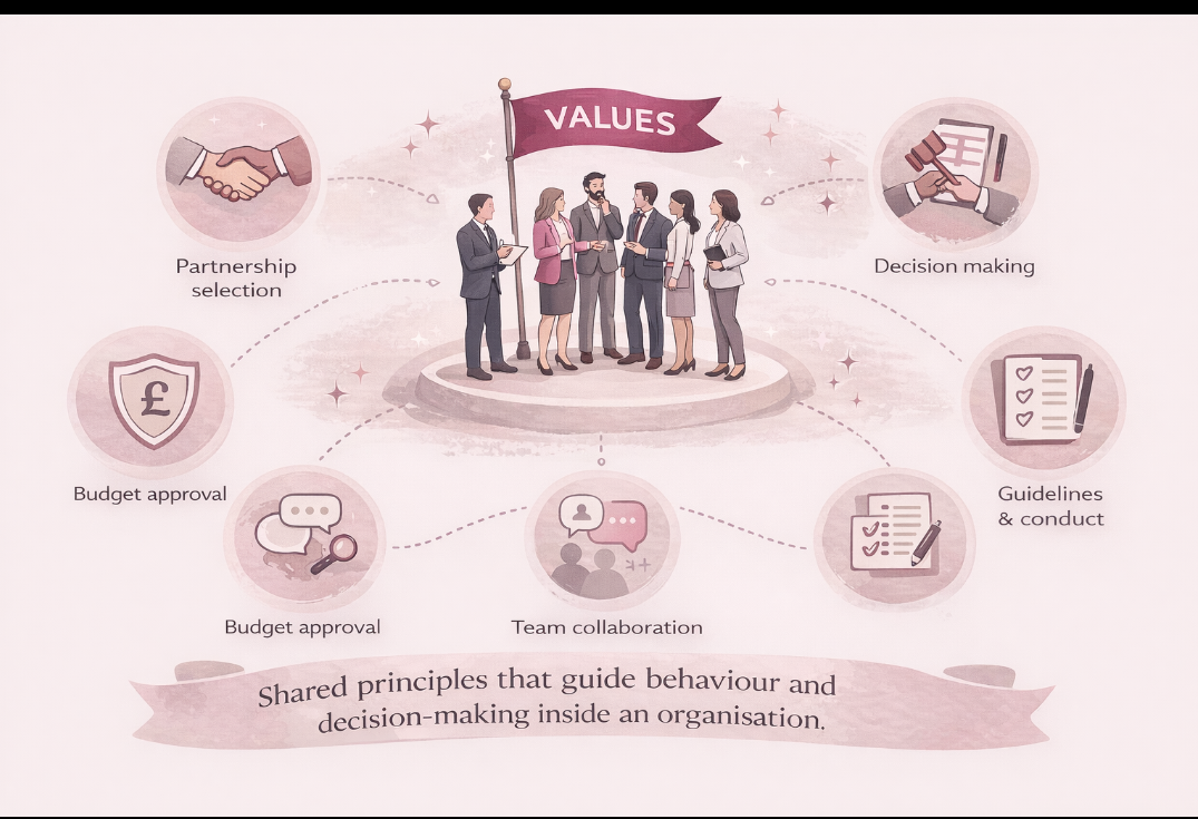 Values are the shared principles that guide behaviour and decision-making inside an organisation.